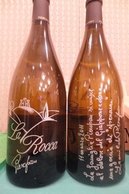 すぐにペンをとりソアヴェ・クラシコ・ラロッカのマグナムボトルに被災者の方へ、励ましの言葉を書かれたそうです。