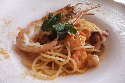 あえてトマトを使わず、手長海老のお味噌と、お出汁のみで味付けしています。