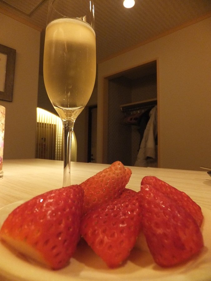 バカラのグラスにシャンパンを注いでもらって、スペシャルディナーの始まりです(*^_^*)